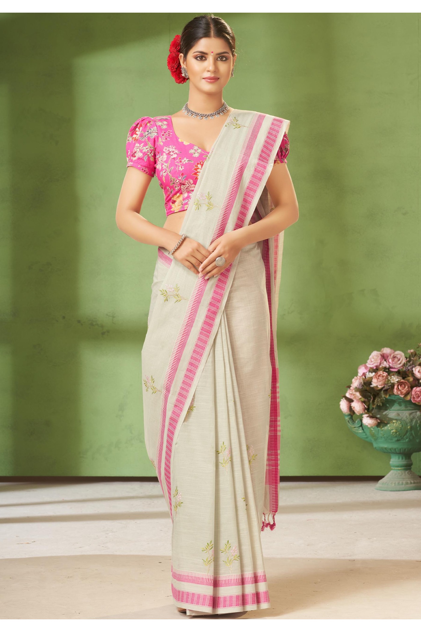 Light Grey Ponduru Khadi-Cotton Saree With Hand Embroidered